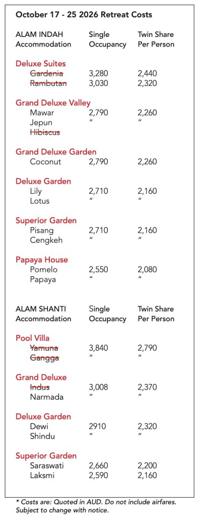 Review the Retreat’s updated T&C’s HERE if you need to withdraw/cancel