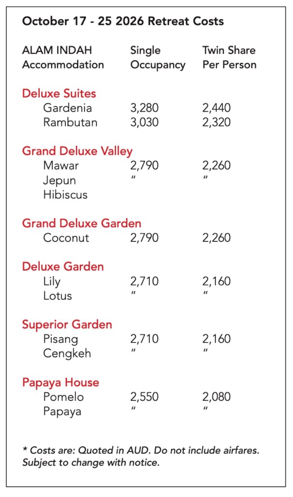 * A retreat information pack will be sent to all participants.
