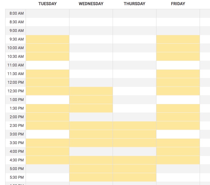 - A dated block can then be confirmed for a day and time, for example: Feb 3 – March 3, Tuesdays at 11.30 for for 5 consecutive weeks.